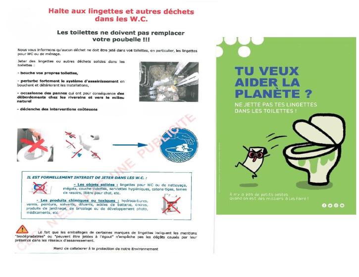 Les lingettes, fléaux des réseaux d'assainissement. Jeter dans les wc, les lingettes, comme de nombreux autres déchets causent de graves dysfonctionnement dans les réseaux, les stations de pompage des eaux usées et les stations d'épuration. Les lingettes sont généralement constituées de plastique et de papier ni recyclables, ni biodégradables. Elles bouchent les canalisations et les pompes de relèvement. L'eau usée n'est plus relevée et ne peut plus s'écouler dans les collecteur d'assainissement, le réseau d'assainissement est mis en charge : les eaux usées remplissent les stations de relèvement et les canalisations. Elles remontent alors dans les maisons où elles s’écoulent par les tampons dans le milieu naturel, polluant ruisseaux, rivières, nappes phréatiques... Après utilisation, jetez vos lingettes dans votre poubelle !